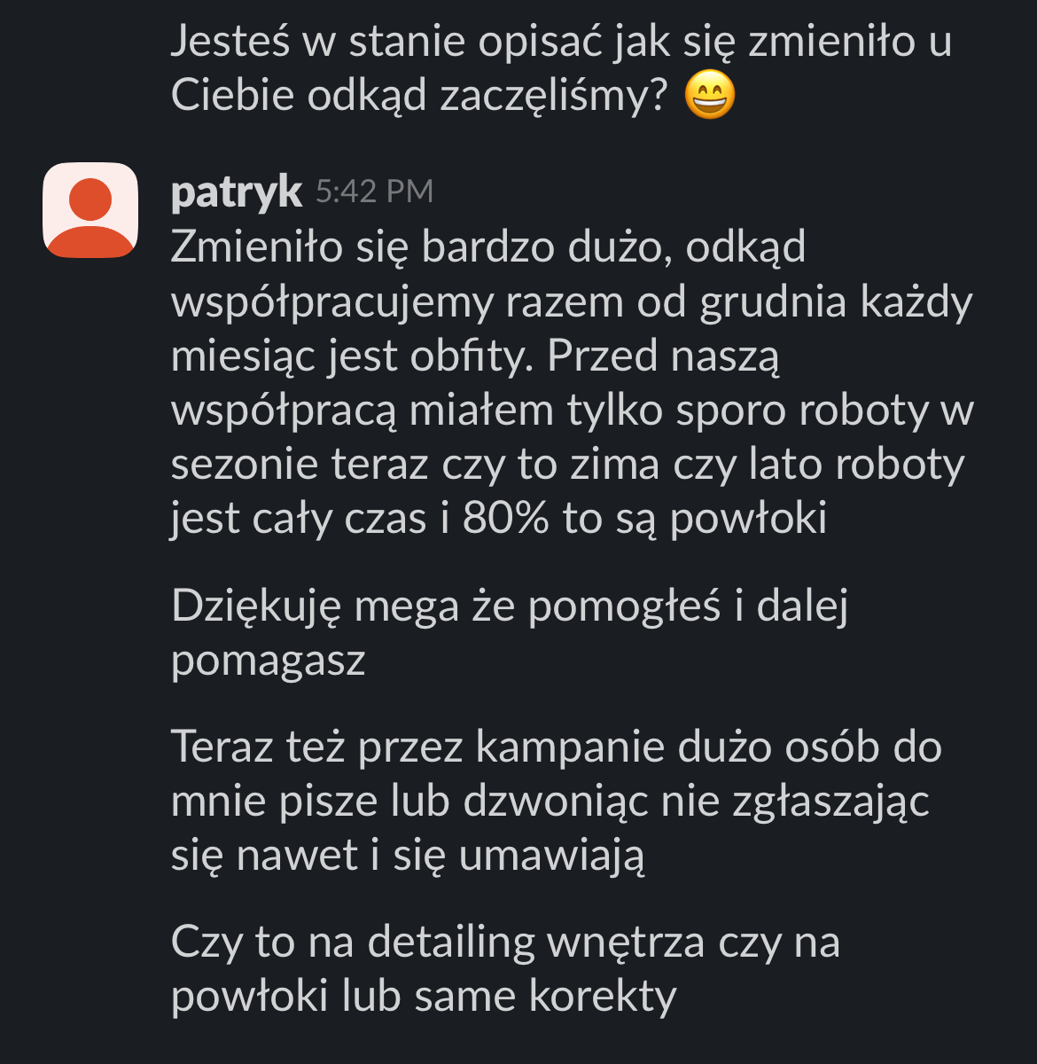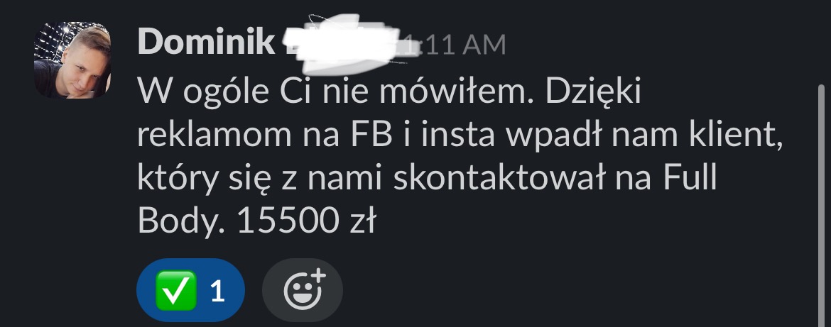 Nasz system generuje stabilny napływ nowych klientów i pomaga w rozwoju Twojej marki. Przykłady? Patryk, który zapisuje klientów na 1,5 miesiąca do przodu od ponad roku czasu. Hubert, który po 2 latach współpracy zapisuje już po 8 fullbody w miesiącu. Czy Łukasz, który od 3 miesiąca zaczął generować stabilne 30k+ w swoim biznesie. Jak będzie u Ciebie? Jeszcze tego nie wiem, ale wiem, że jesteśmy w stanie stworzyć zadowalające rezultaty i pomóc Ci rozwinąć firmę.